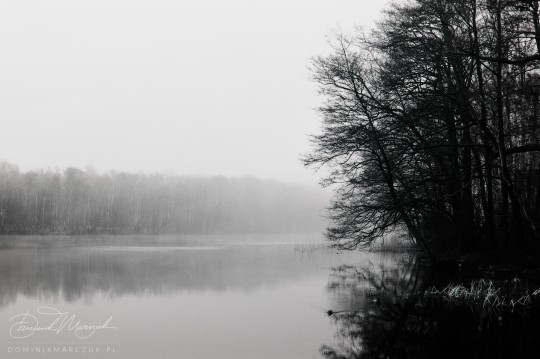 A misty and tranquil scene featuring dark trees leaning over Pusty Staw, a pond in Gdańsk, Poland. The distant bank is almost entirely obscured by the fog.
