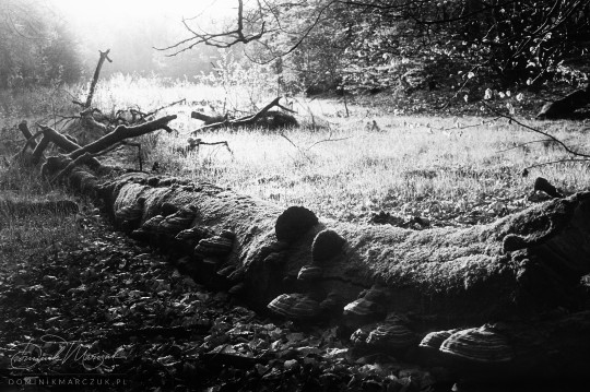 A fallen log covered in moss and bracket fungi lying on a sunlit clearing. Forests of Gmina Kolbudy, Poland. The lowered contrast on the left side is due to light piping (it was the first photo of the roll).