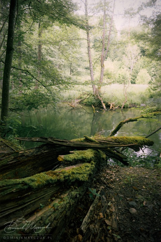 A gnarled, moss-covered fallen log at the bank of River Łyna (near Łańsk, Poland).