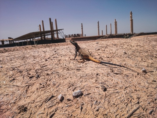 Even among the monumental ruins of Persepolis, life finds a way. This striking golden-brown lizard pauses on a sun-baked stone. Its vibrant, black tail adorned with yellow spots creates a beautiful contrast against the ancient, carved rock. A moment of stillness captured amidst millennia of history.